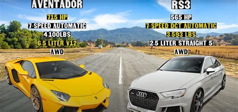 Which is the most efficient? Use our side by side comparison to help you make a decision. 8.3 s @ 100.7 mph: Are you looking to buy a car but can't decide between a audi rs3 or lamborghini aventador? The lamborghini has significantly more power than the audi and has no turbo lag.